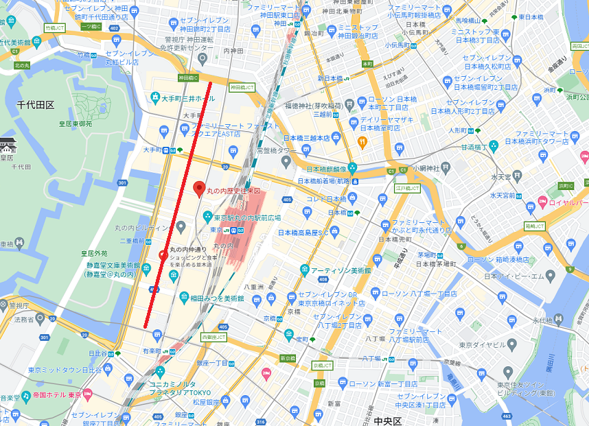 上の赤字の部分が、丸の内仲通り+大手町仲通りとなります。